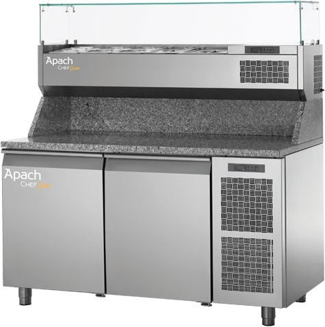 Стол для пиццы APACH Chef Line LTPZ11TUD38 c агрегатом предназначен для охлаждения, хранения и разделки продуктов для пиццы, а также для раскатки теста. Имеет самозакрывающиеся реверсивные дверцы с магнитными трёхкамерными уплотнителями и регулируемые по высоте ножки (100-150 мм).