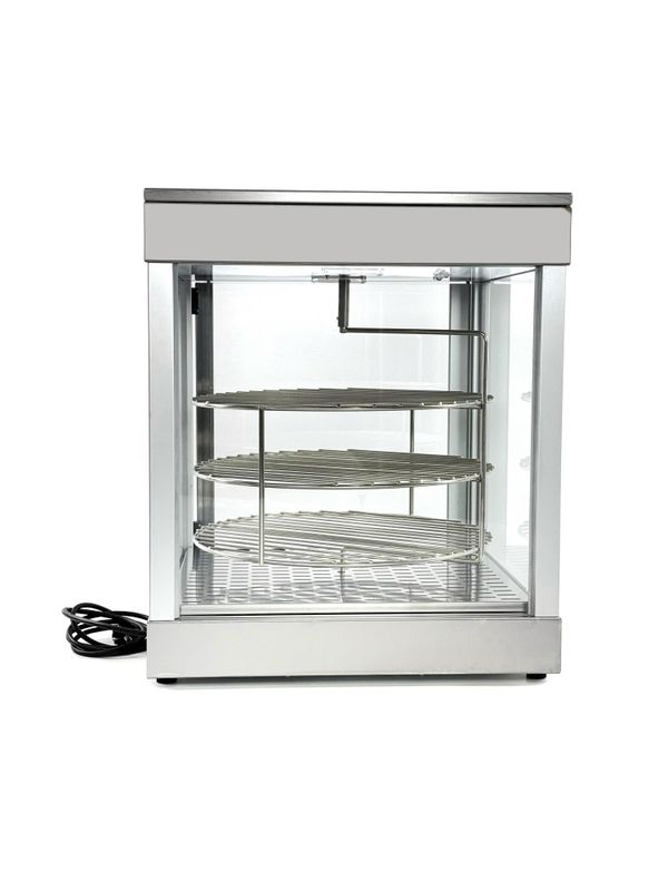 Тепловая витрина APACH Cook Line AVT42 предназначена для подогрева, кратковременного хранения и демонстрации пиццы, а также различных хлебобулочных изделий, закусок и других готовых блюд. Благодаря вращающимся полкам-решёткам, привлекает внимание покупателей и предоставляет им полный обзор продукции. Температура регулируется с помощью термостата. Оснащена ёмкостью для воды. На дверце имеется магнитный замок.