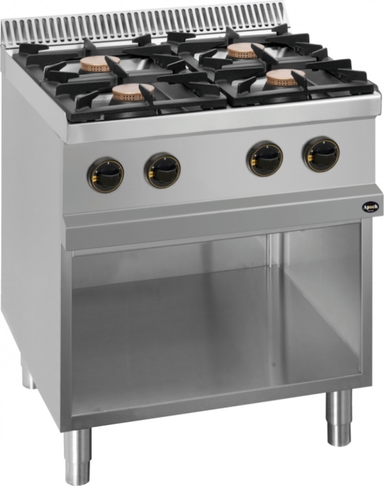 Газовая плита APACH Cook Line APRG-77P 700-й серии предназначена для приготовления и разогрева разнообразных блюд в наплитной посуде. Оснащена открытой подставкой и регулируемыми по высоте ножками. Столешница, вентиляционная решётка и передняя панель выполнены из нержавеющей стали AISI 304 толщиной 1 мм, боковые и задняя панели – из нержавеющей стали AISI 430 толщиной 1 мм, съёмные конфорки – из эмалированного чугуна с латунной крышкой.