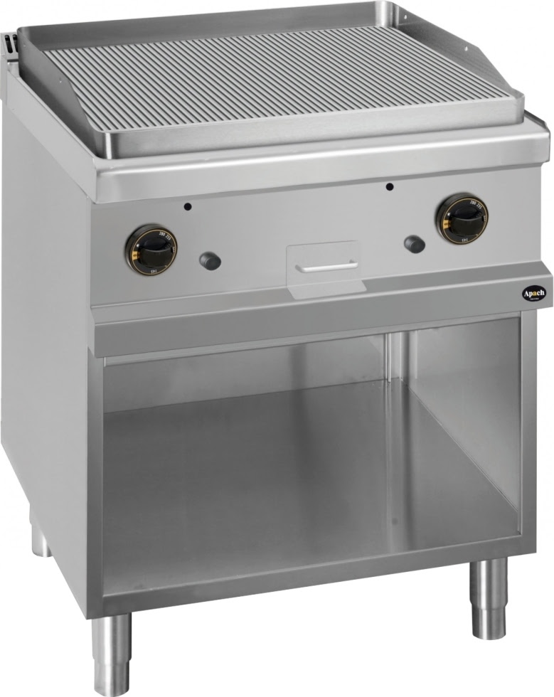 Газовая открытая сковорода APACH Cook Line APTG-77PR 700-й серии предназначена для приготовления блюд из мяса, рыбы, овощей и других продуктов методом жарки. Оснащена 2 независимыми зонами нагрева с рифлёной поверхностью из конструкционной стали толщиной 15 мм. Нагрев производится армированными нагревательными элементами. Имеет открытую подставку и регулируемые по высоте ножки. Столешница, вентиляционная решётка и передняя панель выполнены из нержавеющей стали AISI 304 толщиной 1 мм, боковые и задняя панели – из нержавеющей стали AISI 430 толщиной 1 мм.